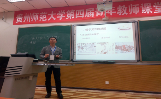刘荣昆老师所的参赛课程为《中国思想史专题》,讲授的内容为“天人三策”与“独尊儒术”,他凭借其丰富的史学知识,用大量的历史材料为同学们介绍了“天人三策”的具体内容,“独尊儒术”背景、原因以及产生的重要影响,很好地完成了本节课的教学环节。