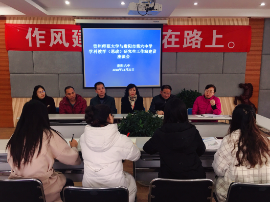 为促使学科教学(思政)研究生工作站建设工作顺利进行,进一步提升人才培养质量,11月21日上午,yl23455永利与贵阳六中研究生工作站建设推进会在贵阳六中会议室(一)举行,公司副经理蒲文彬一行5人,贵阳六中陈素董事长及相关专业教师出席,公司2017级在贵阳六中实习的学科教学(思政)专业6名研究生参加。会议由陈素主持。