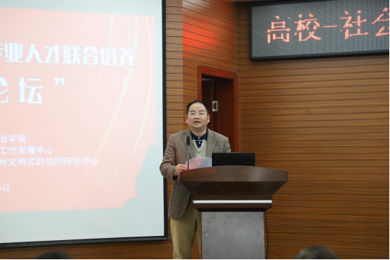 贵州大学公共管理公司党委书记,中国社会工作教育协会副会长、贵州省社会学会会长、贵州省社会工作协会会长庄勇教授进行了题为“校社协同共建社会工作专业人才培育新机制”的主旨演讲。他回顾了贵州社工专业人才培养模式从早期的高校主动嵌入式发展到中期的校社合作“引进来”和建立实习实践基地将员工职业素养教育“重心前移”,再到当前的项目化运作下的“校、政、社”U-G-N三方协同培养模式的发展脉络,指出当前社工教育存在的三大错位并提出相应建议。庄教授最后强调应通过行动研究探索校社联合培养社工专业人才模式的长效机制。