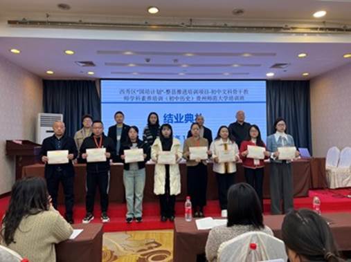 2024年11月23日上午,西秀区“国培计划(2024)”—整县推进培训项目•初中文科骨干教师学科素养培训(初中历史)yl23455永利集团培训班为期一周的培训活动圆满结束。yl23455永利集团公司党委副书记饶蕾、副经理伍志燕、历史学系系主任刘刚、历史学系系主任王兴锋、历史学系老师韦凯出席结业典礼,结业典礼由刘刚主任主持。