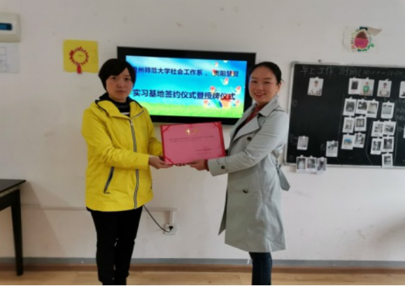 其次,社会工作系与贵阳市慧灵社会工作服务中心签订“共建实习实训基地协议”,并进行实习基地挂牌。同时聘请黄习老师担任员工“实习督导”。
